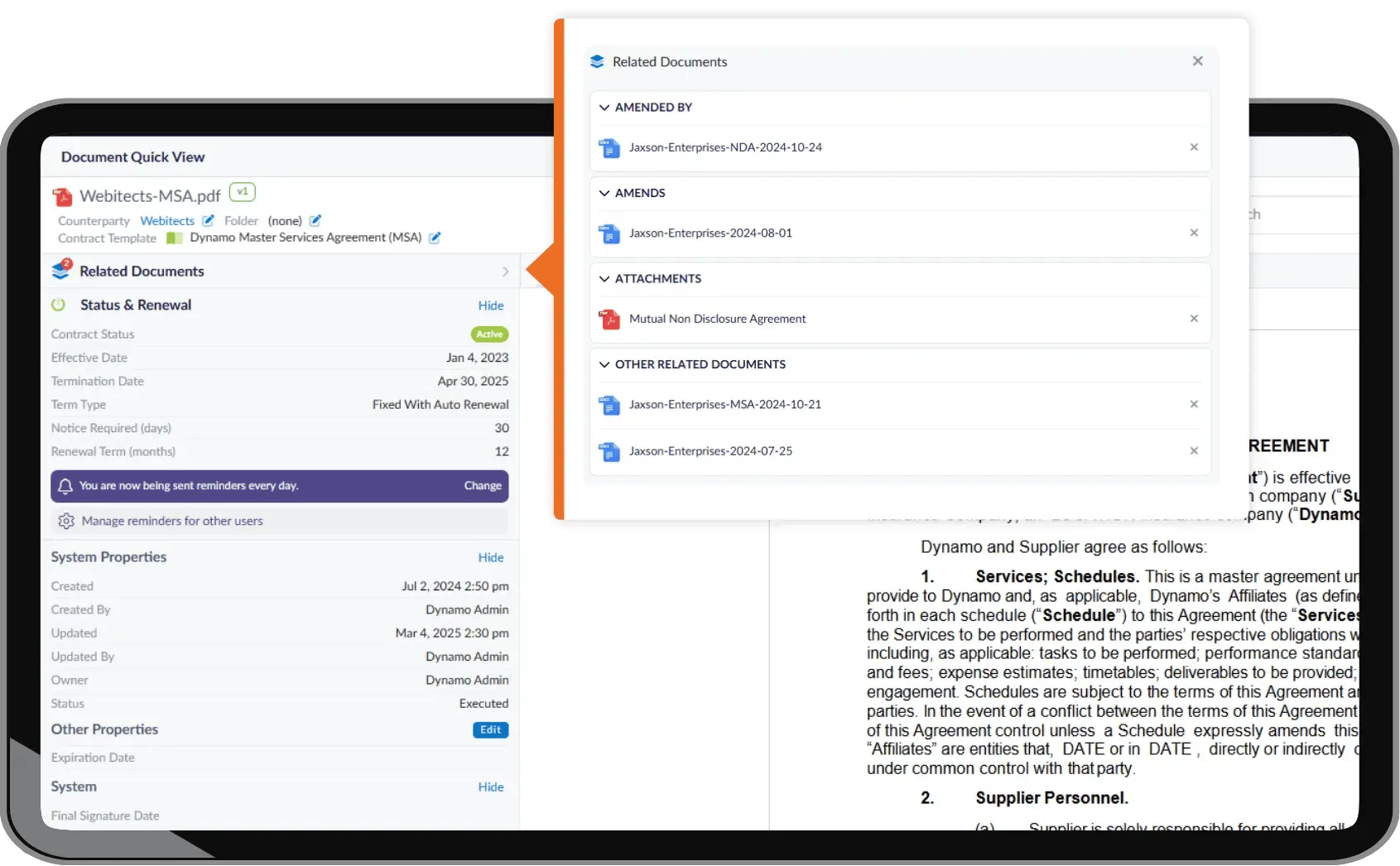 Gain a real-time view of your contracts so you can track key terms, deadlines, and commitments with confidence. No more searching through scattered documents—everything you need is at your fingertips.